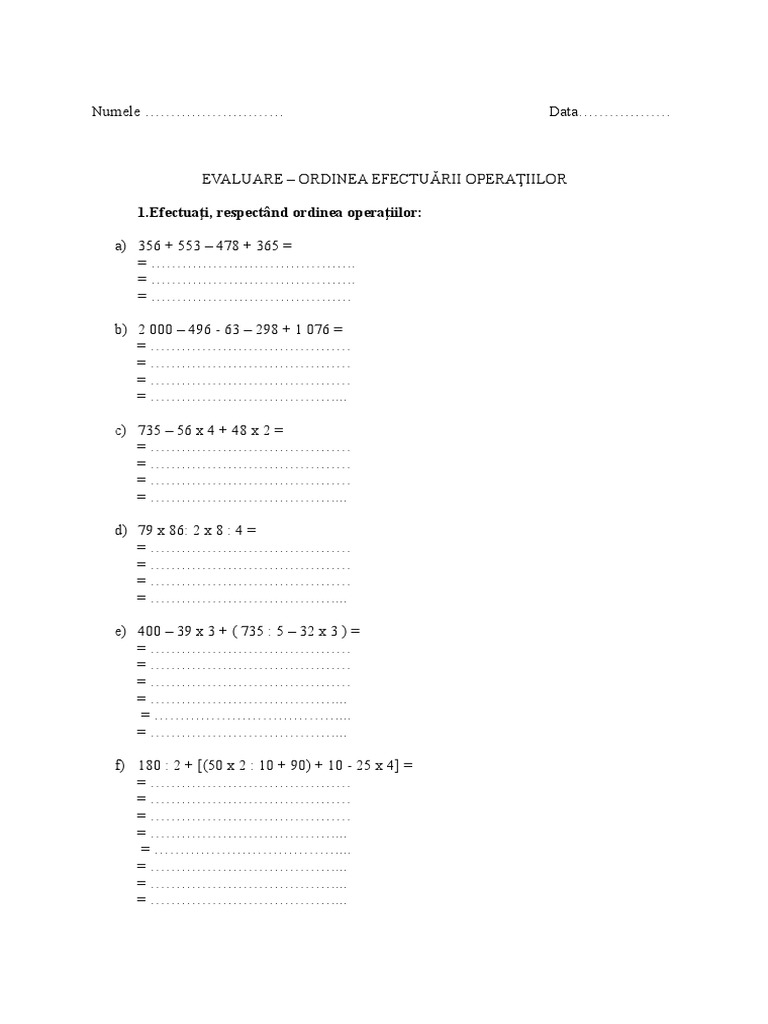Ordinea Efectuării Operațiilor Fișă De Lucru Cu Posibilitate De