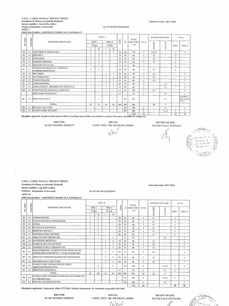 Universitatea De Medicina Si Farmacie Carol Davila Din Bucuresti Plan De Invatamant Anul1