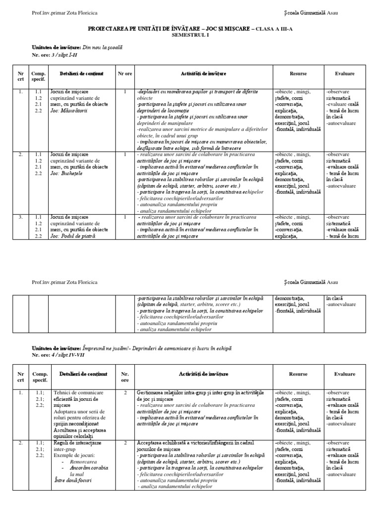 Proiectarea 2020 Pe Unitati De Invatare Joc Si Miscare Clasa 3