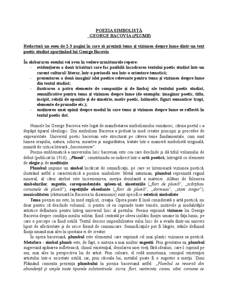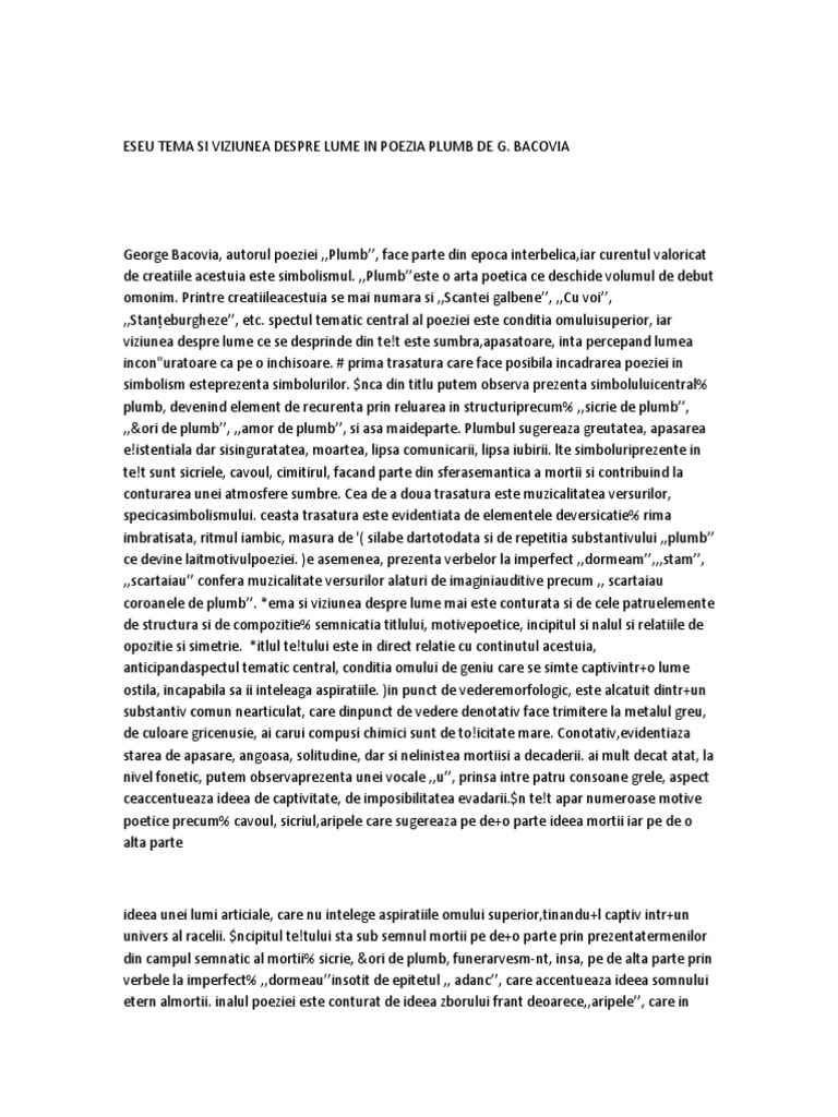 Plumb eseu tema si viziunea despre lume. Plumb tema si viziunea despre lume aparitie. Desi este bine cunoscut statutul de simbolist al artistului bacovia putem afirma despre acesta ca este si. Tema poeziei o constituie condiia poetului ntr o societate lipsit de aspiraii i artificial condiie determinat de dou coordonate eseniale iubirea i moartea. Subiectul al iii lea 30 de puncte varianta 043scrie un eseu de 2 3 pagini în care să prezinţi tema şi viziunea despre lume reflectate într un roman psihologic din perioada interbelică.